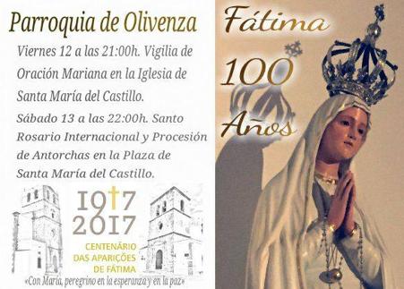 En Olivenza, cuya devoción por la Virgen de Fátima está muy arraigada desde sus orígenes, también se llevarán a cabo actos de culto desde la Parroquia. Este viernes, a partir de las 21:00 horas, habrá una vigilia de oración mariana en la iglesia de Santa María del Castillo. El sábado, 13 de mayo, a las 22:00 horas, tendrá en el mismo lugar el rezo del Santo Rosario Internacional, en varios idiomas, y una procesión de antorchas en la plaza de Santa María del Castillo, en la que los niños portarán la imagen de la Virgen de Fátima.