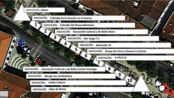 Comenzando desde los quioscos ubicados al inicio del Paseo Grande, las casetas estarán ocupadas en este orden por la Cofradía de la Oración en el Huerto, Cofradía del Descendimiento, 'Alson', San Jorge F.C., Aprosuba-14, Grupo de Coros y Danzas 'La Encina', 'A Vila' E.D., 'Cuenta Conmigo', Murga 'Los Camballotas' y 'Limbo Cultura'.