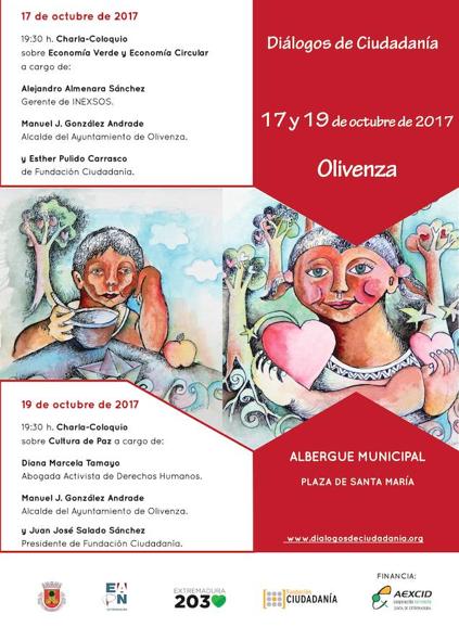 Los Diálogos de Ciudadanía, proyecto para la sensibilización sobre los Derechos Humanos, la Cultura de Paz y el Desarrollo Sostenible financiado por la Agencia Extremeña de Cooperación al Desarrollo (AEXCID), llega en octubren a Olivenza con dos sesiones que se centrarán en Economía Verde y Economía Circular y Cultura de Paz.