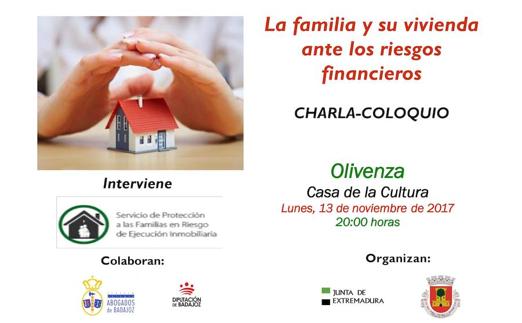 El ciclo de conferencias La familia y su vivienda ante los riesgos financieros, organizado por la secretaría general de Arquitectura, Vivienda y Políticas de Consumo de la Junta de Extremadura, a través del Servicio de Protección a las Familias en Riesgo de Ejecución Inmobiliaria, llega este lunes, 13 de noviembre, a las 20.00 horas, a la casa de la cultura de Olivenza.