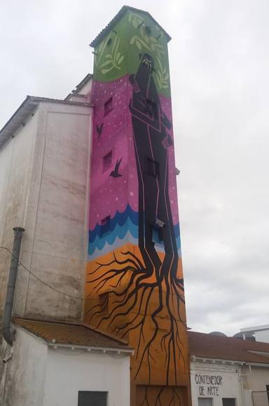 El edificio 'La Triguera', que hasta los años 80 sirvió como silo de cereales, ha sido el lugar elegido en la ciudad de Olivenza para llevar a cabo un proyecto que cuenta en este caso con intervenciones relacionadas con la danza, las artes plásticas y la fotografía, así como una intervención artística exterior que, como en el resto de localidades, identifica la ubicación del Contenedor de Arte, como un espacio en desuso en el entorno rural durante años que ahora se recupera para proyectos de arte efímero. En los últimos días, la propia fachada del histórico edificio se ha pintado con un mural exterior que refleja las relaciones transfronterizas como proceso vivido en Olivenza a lo largo de la historia.
