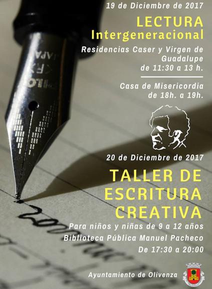 Desde el Espacio de la Creación Joven (ECJ) de Olivenza se indica que también se está intentado crear un grupo de jóvenes y adultos para un taller de escritura creativa este miércoles, 20 de Diciembre, a las 19.00 horas, también en la Biblioteca Municipal 'Manuel Pacheco'. Las personas interesadas en participar pueden contactar con el ECJ a través del correo electrónico olivenzaespacio@gmail.com o a través del teléfono 942 49 11 11.