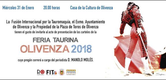 Grandes nombres del mundo de la tauromaquia serán un año más los protagonistas de los festejos taurinos que conforman el cartel de la XXVIII Feria del Toro de Olivenza, cartel que este miércoles, 31 de enero, será presentado por otro de los nombres de referencia del sector: el periodista Manuel Molés.
