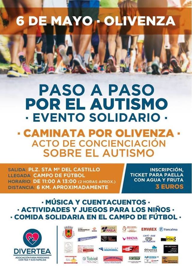 Nuevo llamamiento solidario, en este caso con la actividad 'Paso a paso por el autismo', organizada por la asociación Divertea Olivenza y que tendrá lugar el próximo 6 de mayo en la ciudad. Una caminata solidaria, actividades y juegos para niños y niñas, comida en el entorno del campo de fútbol y música en directo con Murga Los 3W