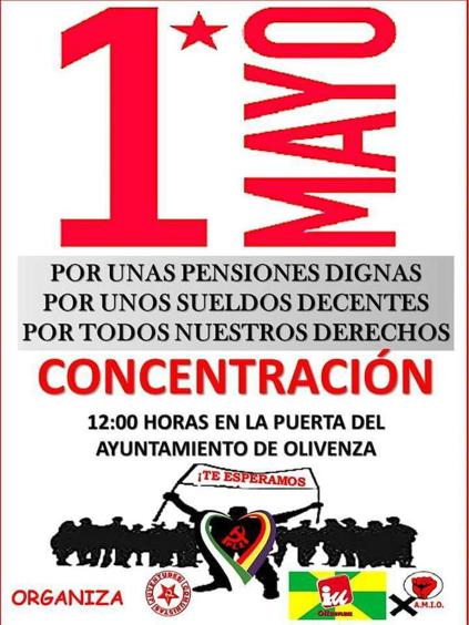 La agrupación local de Izquierda Unida de Olivenza, en conjunción con la de Juventudes Comunistas y la Asociación de Mujeres de la Izquierda Oliventina (AMIO) han realizado un llamamiento general para convocar a la ciudadanía a una concentracón para este Primero de Mayo, que tendrá lugar a las puertas del Ayuntamiento de Olivenza, a partir de las 12.00 horas.