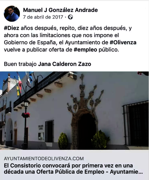 El Partido Popular de Olivenza ha salido al paso del comunicado del Ayuntamiento por el que informa que la Junta de Gobierno Local socialista ha aprobado la Oferta Pública de Empleo 2018. Para los populares oliventinos el gobierno municipal del PSOE ha realizado un «re-anuncio» de la Oferta de Empleo, pues según explican «ya la anunció en abril de 2017 y parece ser que la ha tenido paralizada para volver a publicarla más de un año después». Para ello, también se apoyan en imágenes de los anuncios en redes sociales que en el último año ha venido realizando el alcalde, Manuel J. González Andrade.