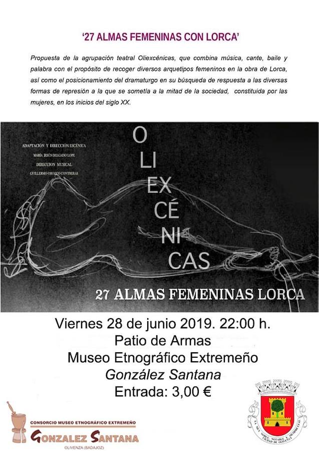 La agrupación teatral OliExcénicas representará este viernes, 28 de junio, a partir de las 22.00 horas, en el patio de armas del castillo de Olivenza, la obra '27 almas femeninas con Lorca', un espectáculo en el que se combinan teatro, música, cante, baile para dar vida a los versos de Federico García Lorca, uno de los poetas más destacados de la Generación del 27.