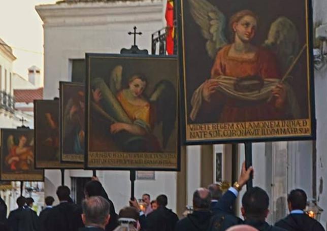 Esta procesión se desarrolla cada jueves con diez banderas (lienzos), de principios del siglo XVIII, que representan la Pasión y Muerte de Jesucristo, a excepción de los que representan como tema a la Virgen de la Misericordia, quien cobija bajo su manto a todo el pueblo portugués. A esta peculiar procesión, que también sale con un pequeño Cristo, tallado en 1818 por el escultor real portugués Joquim Joze de Barros, la acompañó la Filarmónica de Olivenza.