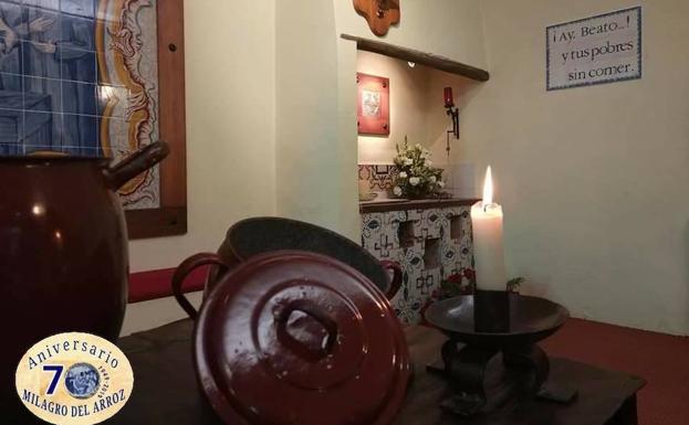 Y es que fue precisamente Leandra Rebollo, natural de Ribera del Fresno, cocinera de la Institución Hogar de Nazaret, quien aquella mañana de 1949 pidió por mediación de San Juan Macías, al que le tenía gran devoción, para que los pobres pudieran comer aquel domingo: «Ay, Beato, y tus pobres sin comer», multiplicándose el poco arroz que había en la olla, en un tiempo en el que había poco de comer y donde abundaba la miseria social en Olivenza.