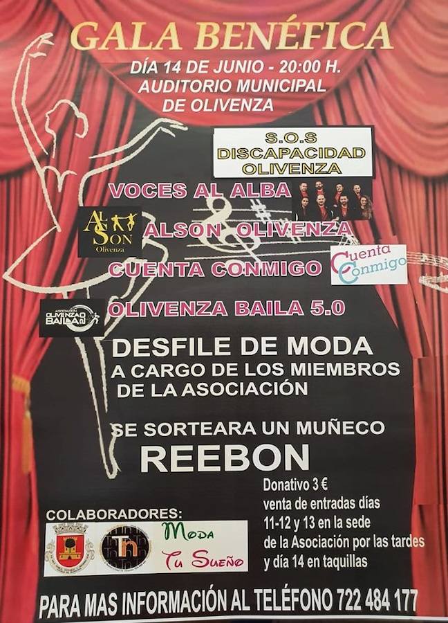 La Asociación 'Olivenza SOS Discapacidad' realizará este viernes 14 de junio, a las 20.00 horas, en el auditorio municipal una gala benéfica en la que se disfrutará, por un precio de entrada de 3 euros, de las actuaciones del grupo Voces al Alba, de Alconchel, y de las agrupaciones de baile local Alson, Cuenta Conmigo y Olivenza Baila 5.0; además de pases de moda y un sorteo de un muñeco Reborn.
