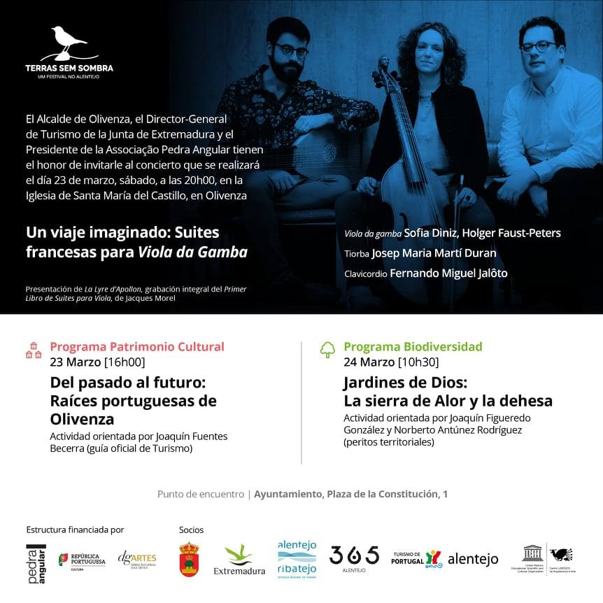 Olivenza será este fin de semana destino del Festival 'Terras sem Sombra'. Conocer sus raíces portuguesas, escuchar algunas de las más bellas suites para viola da gamba en la iglesia de Santa María del Castillo e ir al encuentro de la biodiversidad de la Sierra de Alor son las coordinadas de un prometedor viaje al corazón de la raya. Abierta a todos los interesados, esta iniciativa es resultado de la colaboración entre el festival alentejano, la Dirección General de Turismo de Extremadura y el Ayuntamiento de Olivenza.