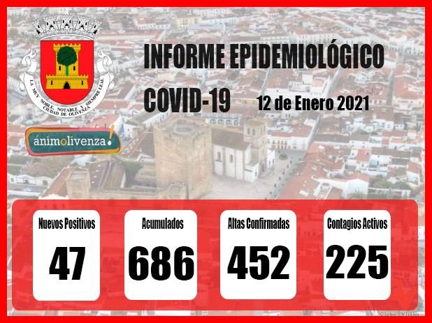 La dirección general de Salud Pública de la Junta de Extremadura notificó este martes, 12 de enero, 47 nuevos contagios por Covid-19 en Olivenza (de los que uno se ha registrado en San Benito de la Contienda y otro en San Rafael de Olivenza), no comunicándose altas epidemiológicas. La autoridad sanitaria también ha informado de la defunción de un varón de 91 años de edad como consecuencia del Covid-19, por lo que ya son 10 las personas fallecidas por coronavirus según datos oficiales.