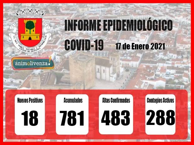 Este domingo, 17 de enero, la dirección general de Salud Pública de la Junta de Extremadura ha notificado 18 nuevos contagios por Covid-19 en Olivenza (de los que dos se han registrado en San Francisco de Olivenza y otro en San Rafael de Olivenza), no comunicándose altas epidemiológicas. La buena noticia es que también se ha anunciado el cierre de un brote de carácter social, con 71 casos positivos y 84 contactos.