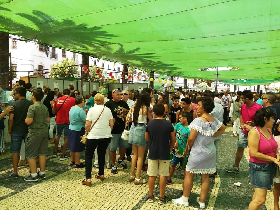 Concluidos los actos institucionales y religiosos propios de la jornada, a las 13.00 horas se abrirán de forma oficial las casetas para la venta de comida y bebida por asociaciones locales en la plaza de España (Paseo Grande). Comenzando desde los quioscos ubicados al inicio de este espacio, las casetas serán ocupadas este año según el sorteo realizado el pasado 2 de septiembre para asignarlas, participando este año el Club de Fútbol San Jorge, la Cofradía del Descendimiento, la Murga 'Los Camballotas', la comparsa 'Tarakanova', el grupo 'Alson Olivenza' y la Cofradía de 'Los Obreros'. Las asociaciones ofrecerán bebida y comida a precios populares.