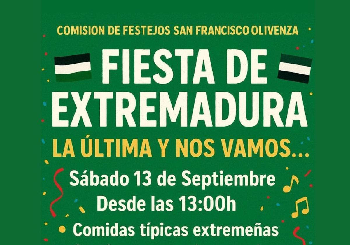 La Comisión de Festejos de San Francisco de Olivenza organiza el próximo sábado 13 de septiembre, a partir de las 13.00 horas, la tradicional Fiesta de Extremadura, que se celebrará en las Escuelas Viejas de la pedanía colona.
