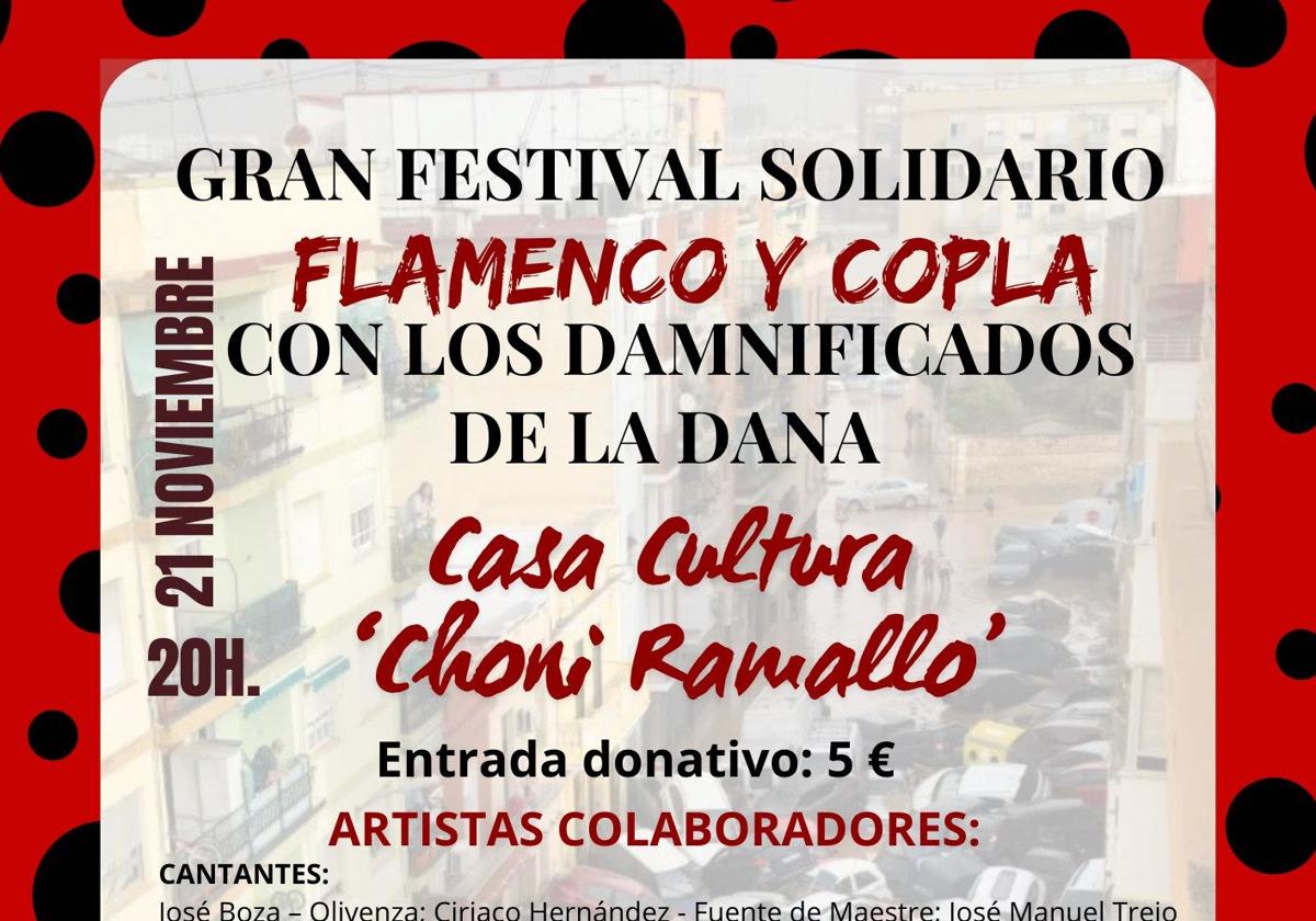 Con el objetivo de recaudar dinero para donar a los damnificados por la terrible DANA de Valencia, la Peña Cultural Flamenca-Asociación 'Amigos de Olivenza' organiza un gran Festival de Flamenco y Copla.