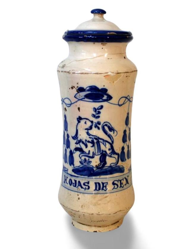 Todo ello cobija la imagen de un león rampante y sobre él unas hojas, clara alusión al producto que contenía esta pieza, 'hojas de sen', como se puede leer en la cartela existente a los pies del escudo. Se cubre con tapadera abombada, de borde azul y pequeño pomo.