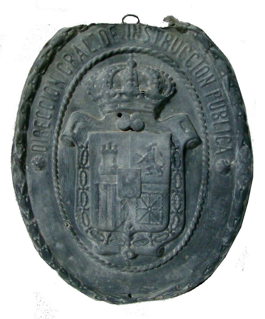 Con unas dimensiones de 56 x 46 centímetros, en ella se reconoce el escudo real usado durante el reinado de Alfonso XII; se trata de un blasón cuartelado, rematado por corona con ocho florones, de los que son visibles cinco, acabada en orbe y cruz que faltan. Todo él se rodea del collar de la orden del Toisón de Oro. En los cuarteles se distingue un castillo con tres almenas, símbolo del reino de Castilla, un león rampante coronado, alusivo a la corona de León, las barras verticales, referidas a Aragón, cadena puesta en orla, en cruz y en aspa, que personalizan a Navarra. En el centro del blasón, tres flores de lis, representando a la monarquía Borbón-Anjou, mientras que en la parte inferior, se reconoce el emblema de Granada. Rodeando al escudo, en la parte superior, se lee, 'Dirección Gral de Instrucción Pública'; en el resto, ilegible, debería aparecer: 'Escuela Pública Elemental de Niños'.
