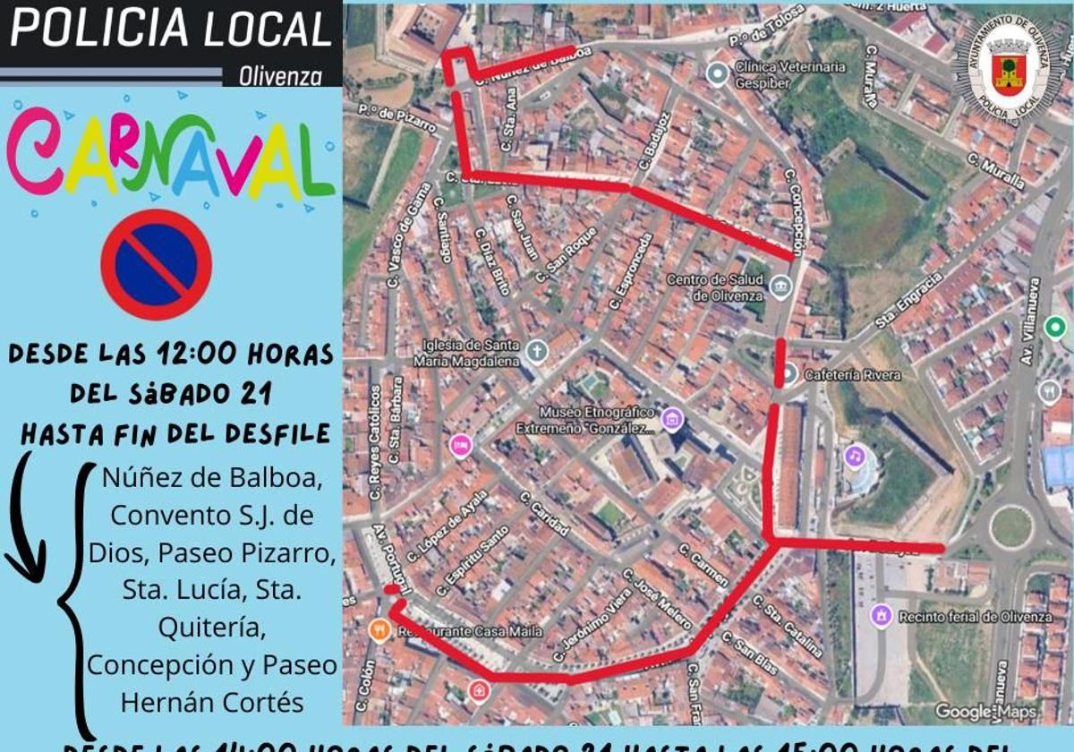 La Policía Local de Olivenza ha informado de las restricciones de tráfico y estacionamiento que se aplicarán con motivo de la celebración del Carnaval 2026, especialmente durante los desfiles previstos para el sábado 21 y el domingo 22 de febrero.