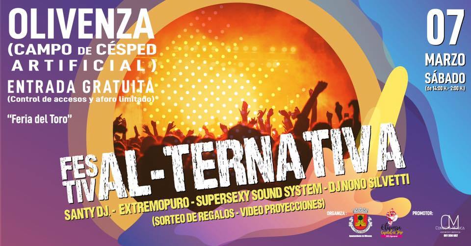 Con motivo de la celebración de la XXX Feria del Toro de Olivenza, se podrá disfrutar este sábado, 7 de marzo, con entrada gratuita, del primer FestivAl-Ternativa en el campo de fútbol de césped artificial desde las 14.00 hasta las 02.00 horas. Según informa el Ayuntamiento de Olivenza, este espectáculo tendrá acceso controlado y aforo limitado, y viene a sustituir el habitual espacio de esparcimiento y ocio juvenil de la feria taurina que por razones de seguridad no se habilitará este año.