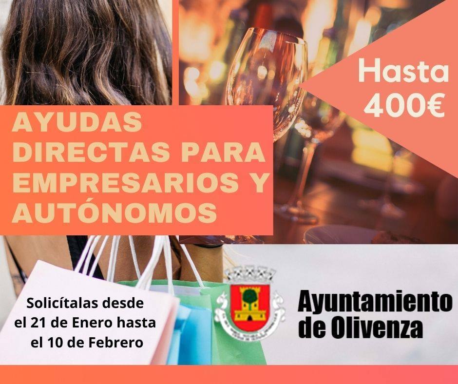 El Ayuntamiento de Olivenza concederá hasta un máximo de 400 euros a todas aquellas empresas y autónomos que se han visto afectadas por cierre temporal, en algún momento, como consecuencia de algunas de las medidas excepcionales de los diferentes estados de alarmas o decretos sobre medidas restrictivas, para el desarrollo normalizado de su actividad, a causa de la Covid-19.