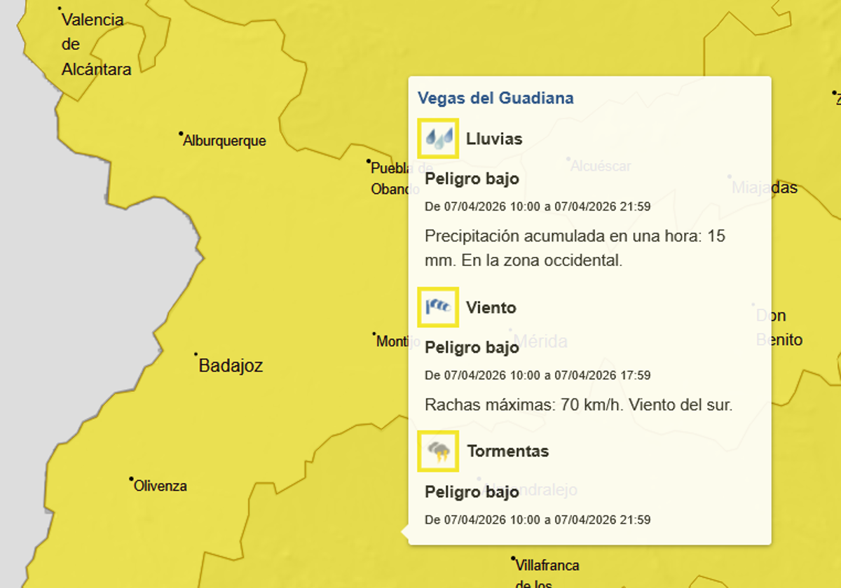 Las Vegas del Guadiana, ... donde se ubica Olivenza, estarán en alerta amarilla por fuertes vientos, lluvias y tormentas. Con una probabilidad de entre el 40%-70% se espera una precipitación acumulada en una hora de 15 litros.