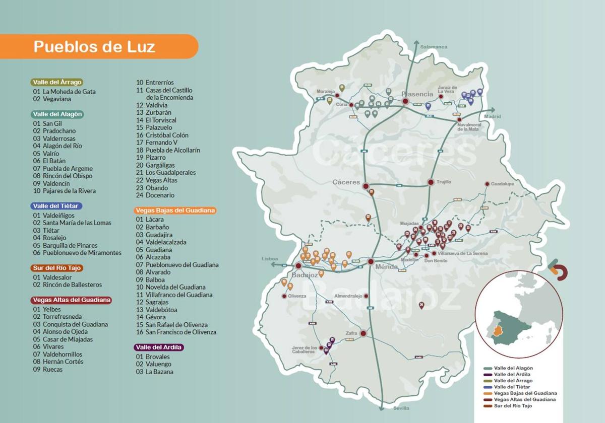Además, se han creado siete rutas: Valle del Árrago, Valle del Alagón, Valle del Tiétar, Ruta Sur del Río Tajo, Vegas Altas del Guadiana, Vegas Bajas del Guadiana y Valle del Ardila. Se pretende que sean un elemento integrador y dinamizador de la economía local. Junto con las rutas, cuatro itinerarios temáticos bajo la marca Pueblos de Luz: 'De vetones a colonos por los valles del Árrago y el Alagón', 'Pimentón y gastronomía a la vera de Carlos V', 'Aves, cielos y arrozales' y 'Frutales, dehesas, jamón y toros'.