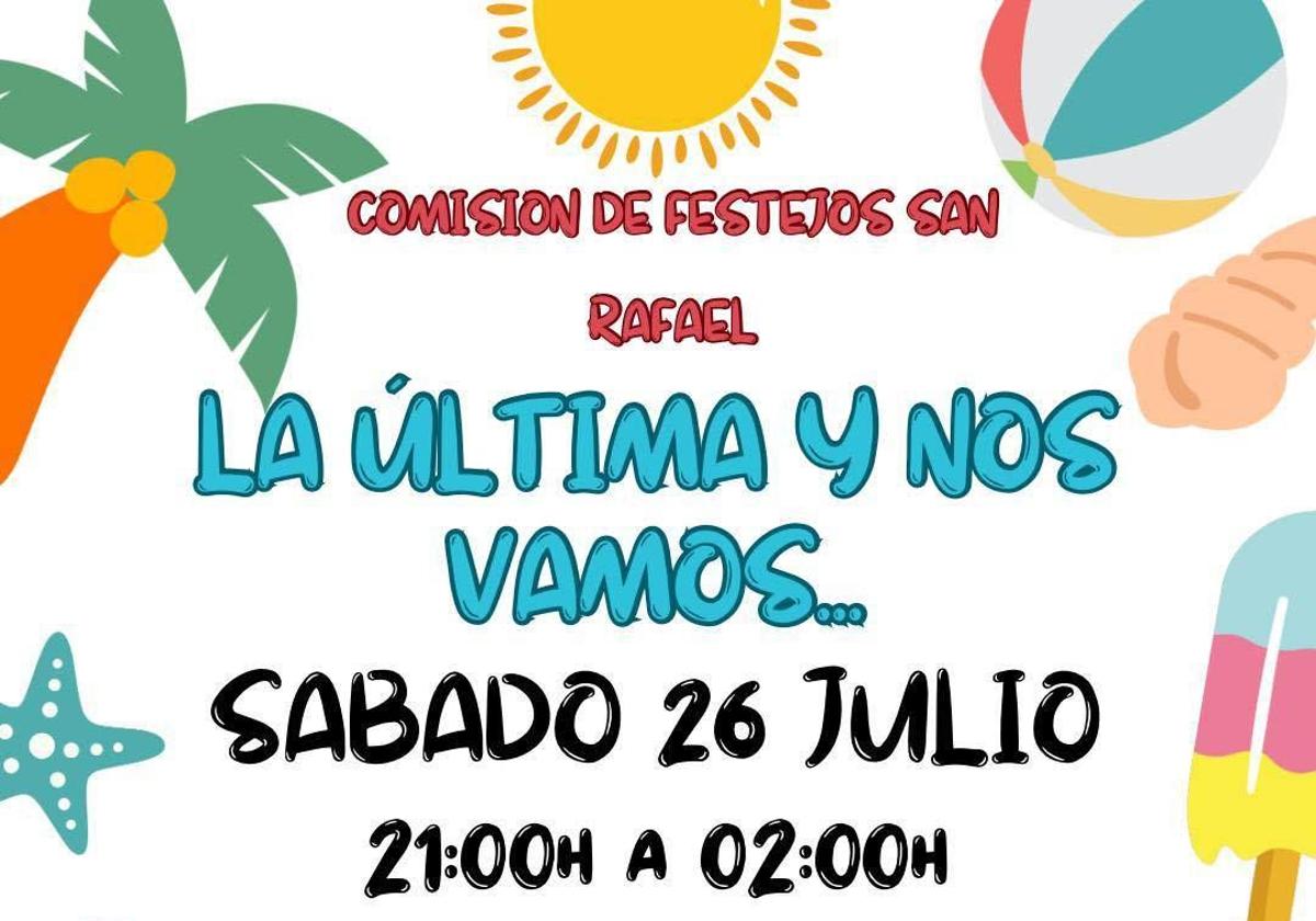 La pedanía oliventina de San Rafael se prepara para vivir una animada noche de verano con la celebración de 'La última y nos vamos…', un evento organizado por la Comisión de Festejos San Rafael que tendrá lugar el próximo sábado 26 de julio, desde las 21.00 hasta las 2.00 horas.