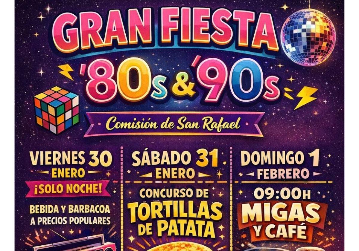 La pedanía de San Rafael de Olivenza vivirá este fin de semana un viaje al pasado con la celebración de una fiesta temática dedicada a las décadas de los años 80 y 90. La iniciativa, organizada por la Comisión de Festejos San Rafael y con la colaboración del Ayuntamiento de Olivenza, combinará música, ambiente festivo y propuestas gastronómicas a precios populares.