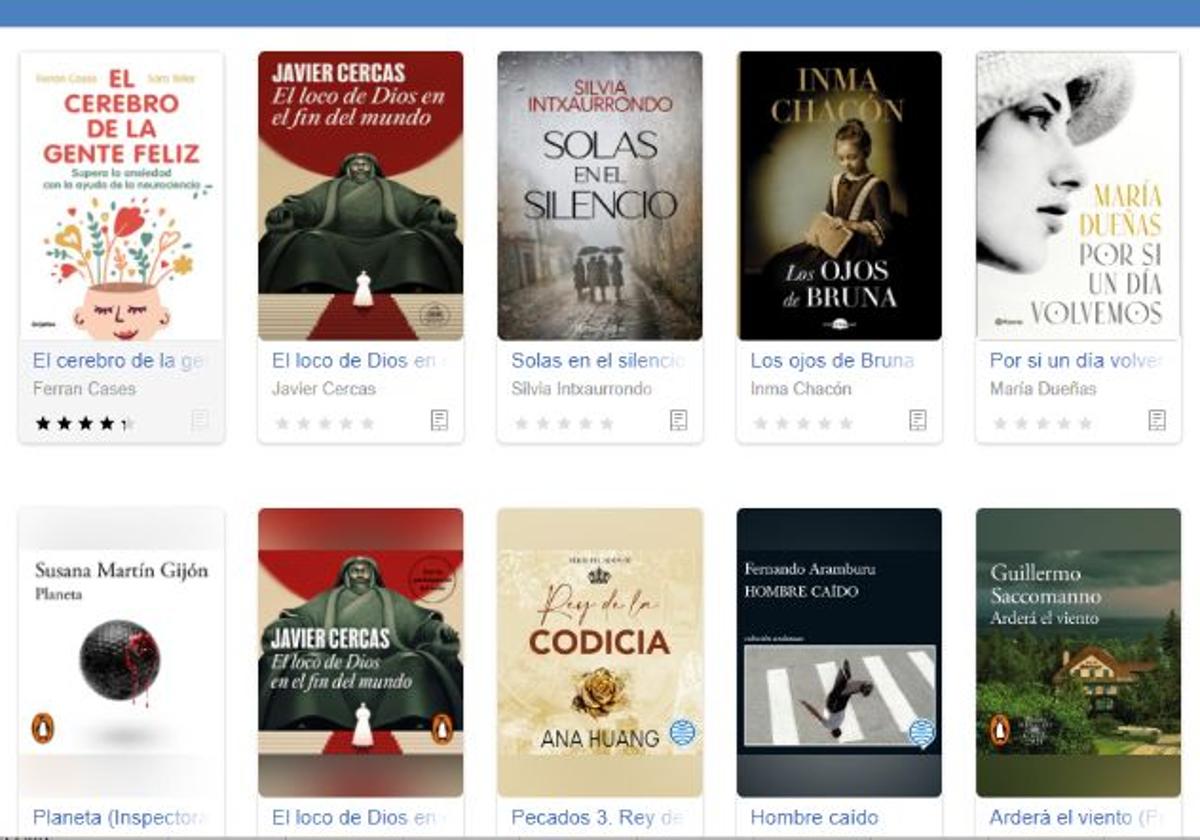 Se pueden leer y/o escuchar libros electrónicos y audiolibros como Animales difíciles, de Rosa Montero, Sueños de bronce de Camila Läckberg, El albatros negro de María Oruña, Hombre caído, de Fernando Aramburu o Victorian Psycho de Virginia Feito.
